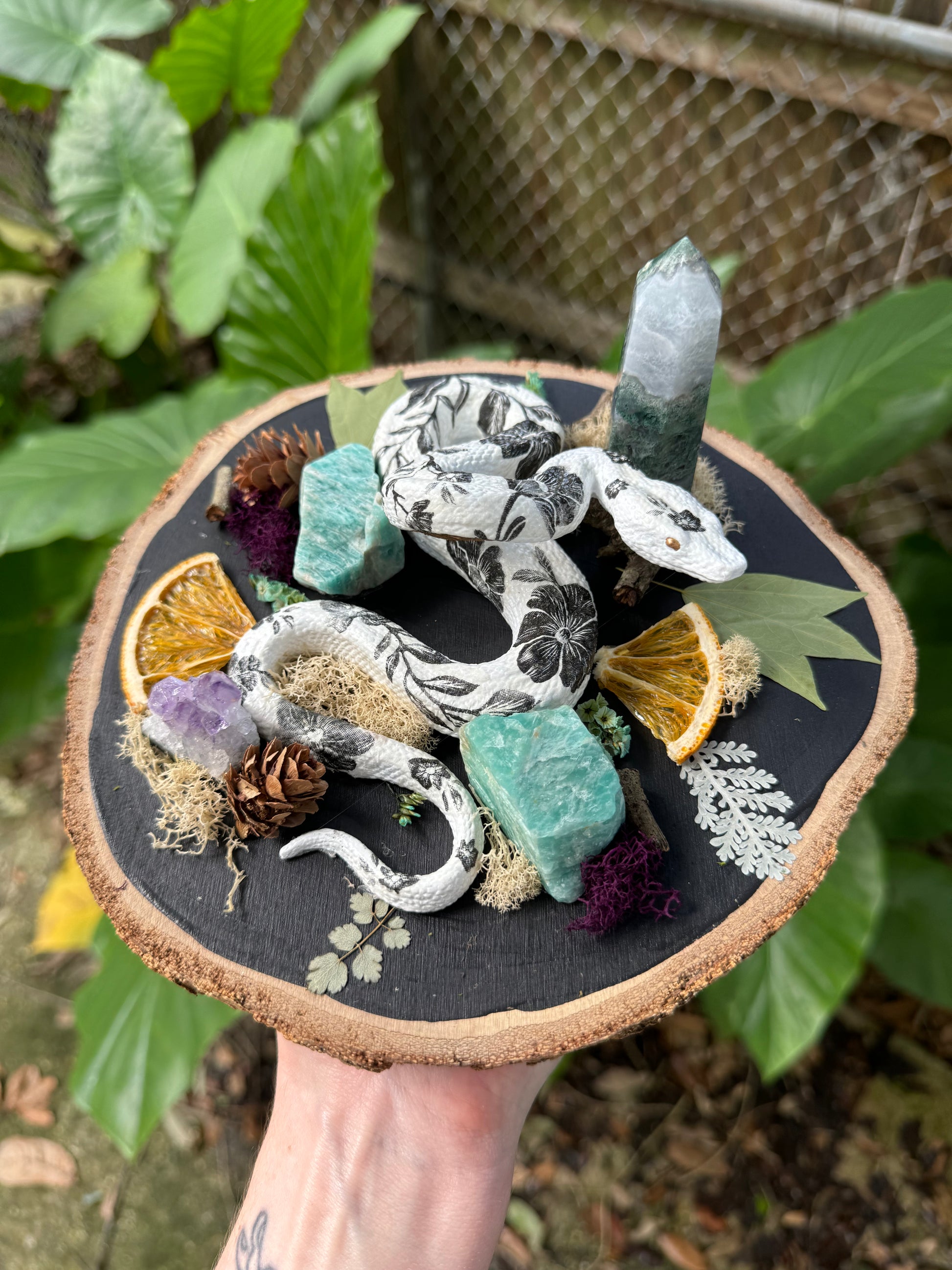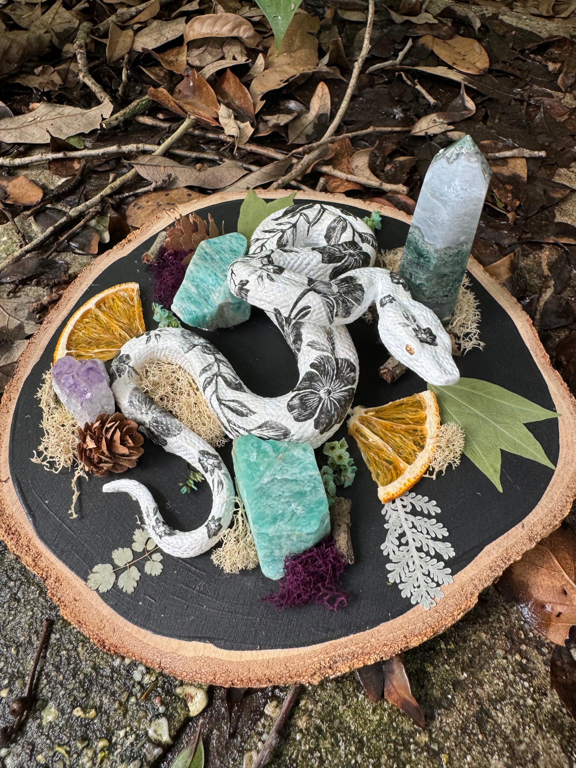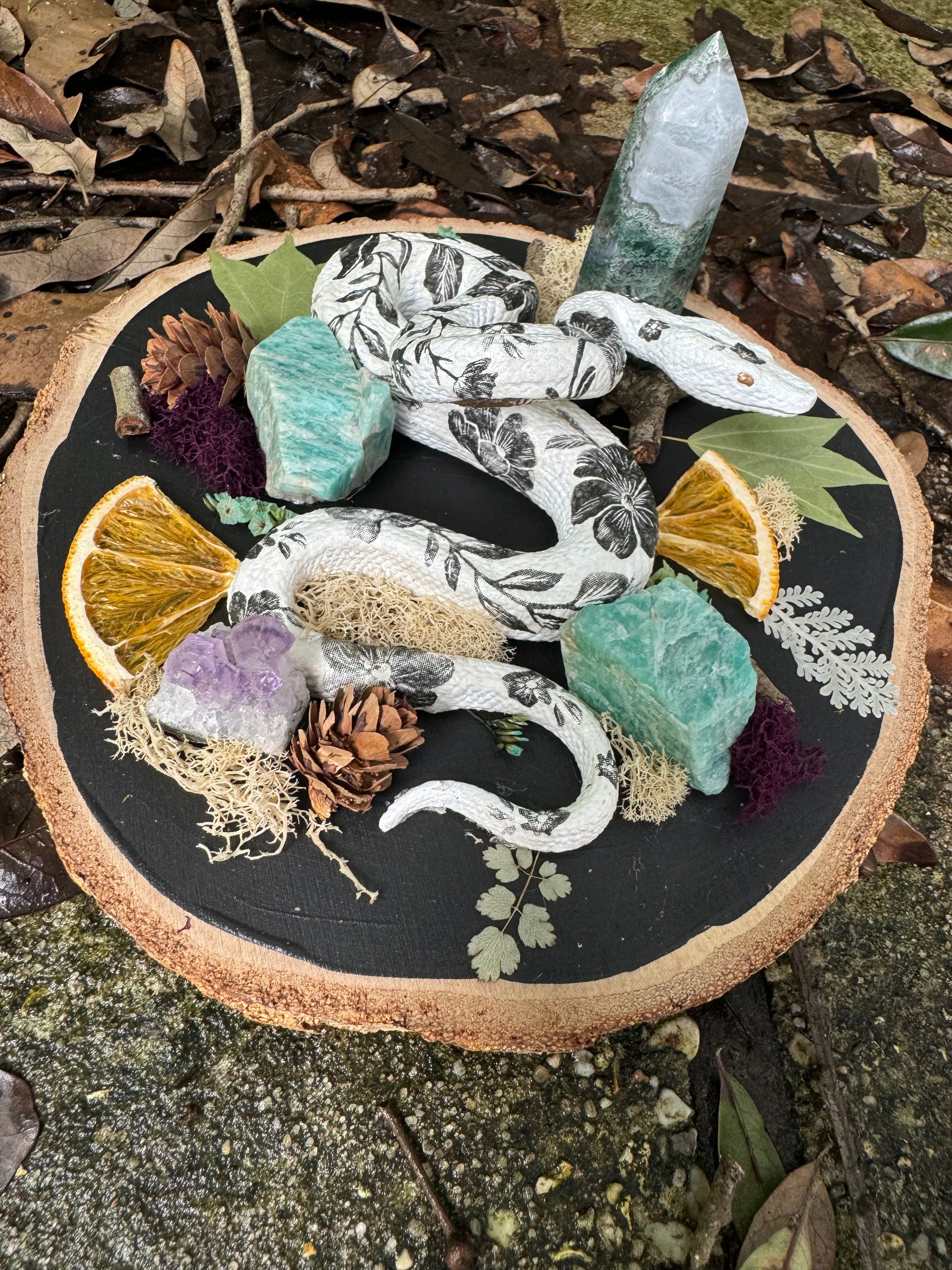Plastic snake decorated in a black and white foliage pattern. Surrounding your snake is an assortment of preserved florals, crystals, and moss.