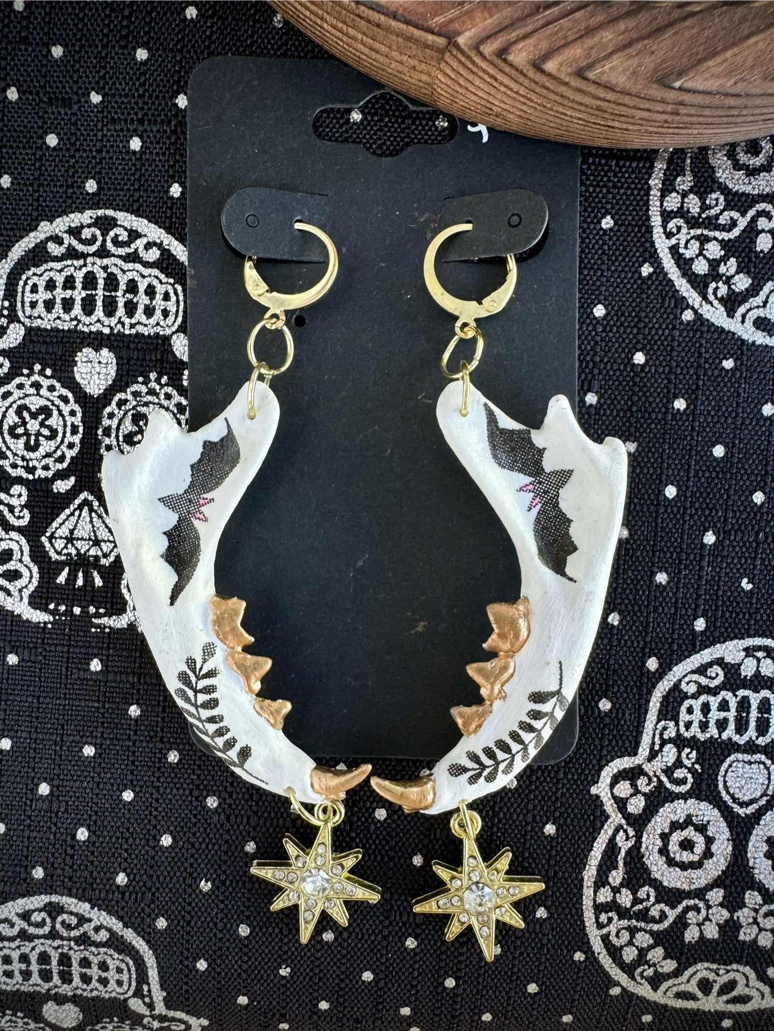 One pair of resin feline jawbone earrings decorated with a Halloween bat on them. 18k gold plated leverback style earrings.