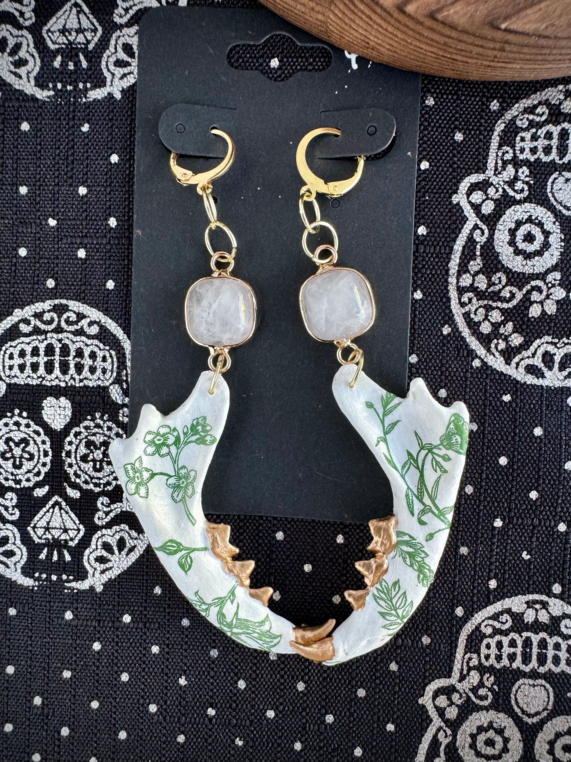 One pair of resin feline jawbone earrings decorated with a green illustrative pattern. 18k gold plated leverback style earrings.