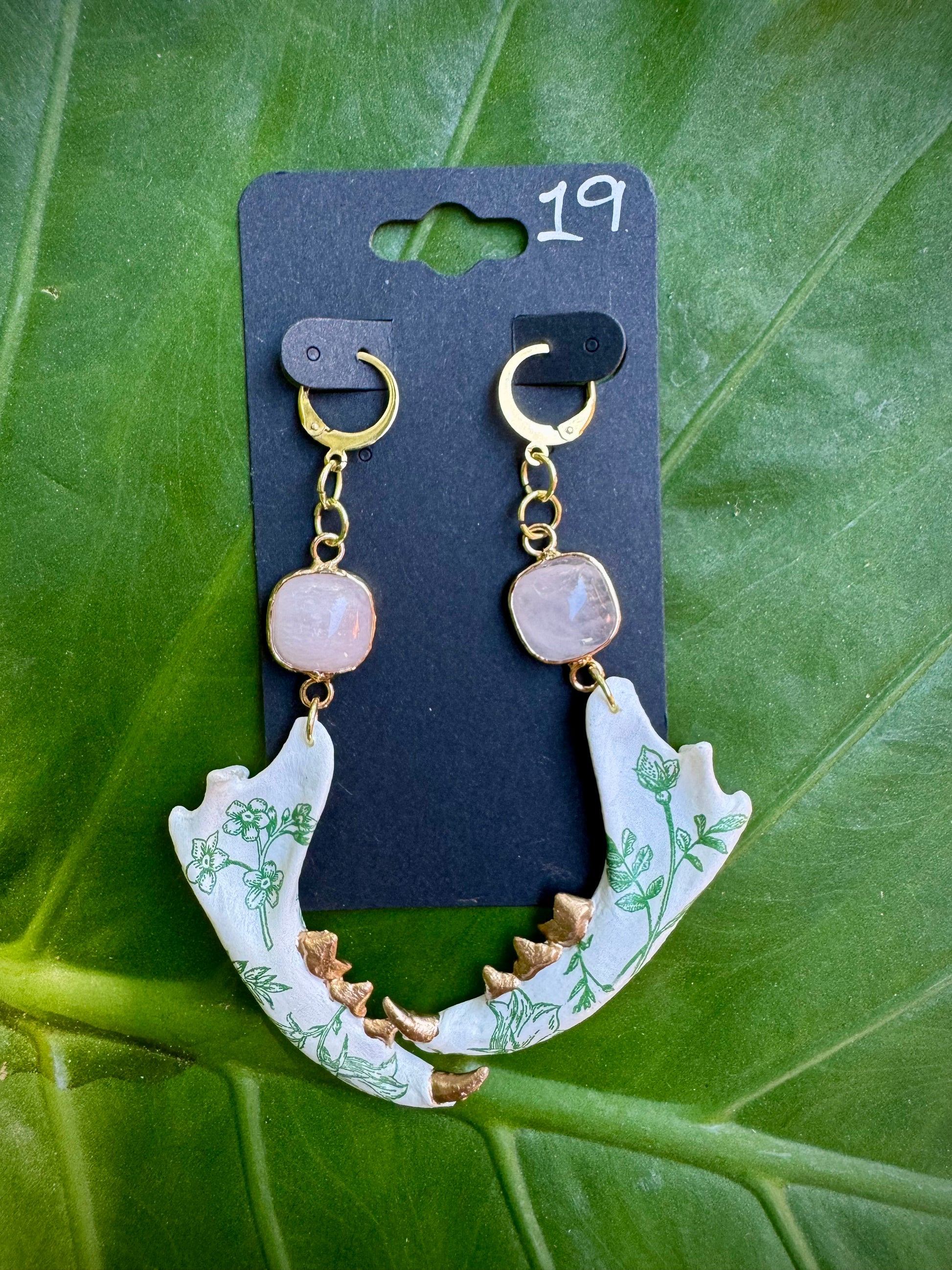 One pair of resin feline jawbone earrings decorated with a green illustrative pattern. 18k gold plated leverback style earrings.