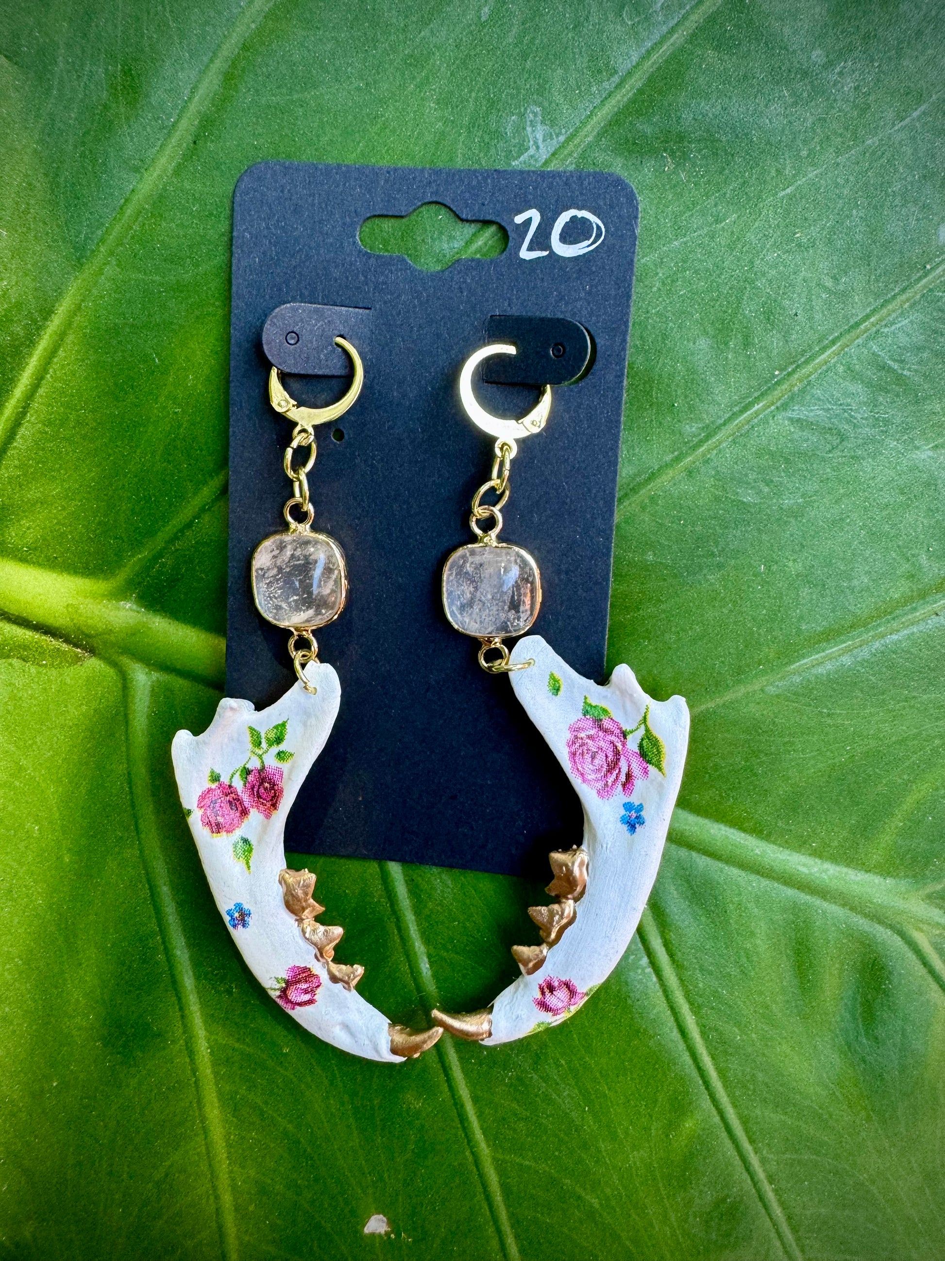 One pair of resin ffeline jawbone earrings decorated with a rose pattern. 18k gold plated leverback style earrings.