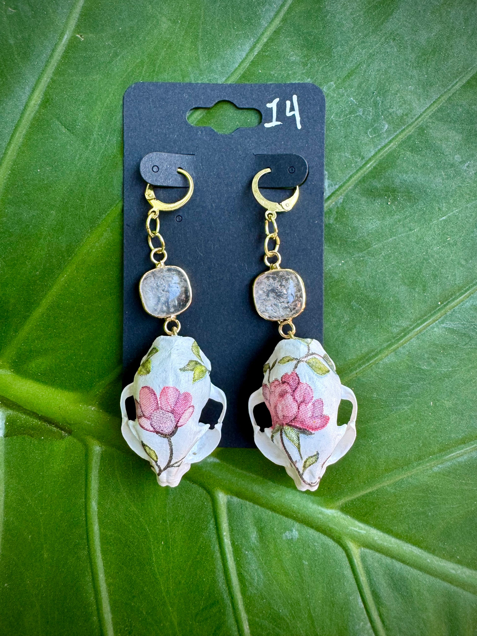 One pair of resin mini cat skull earrings decorated with a floral pattern. 18k gold plated leverback style earrings.