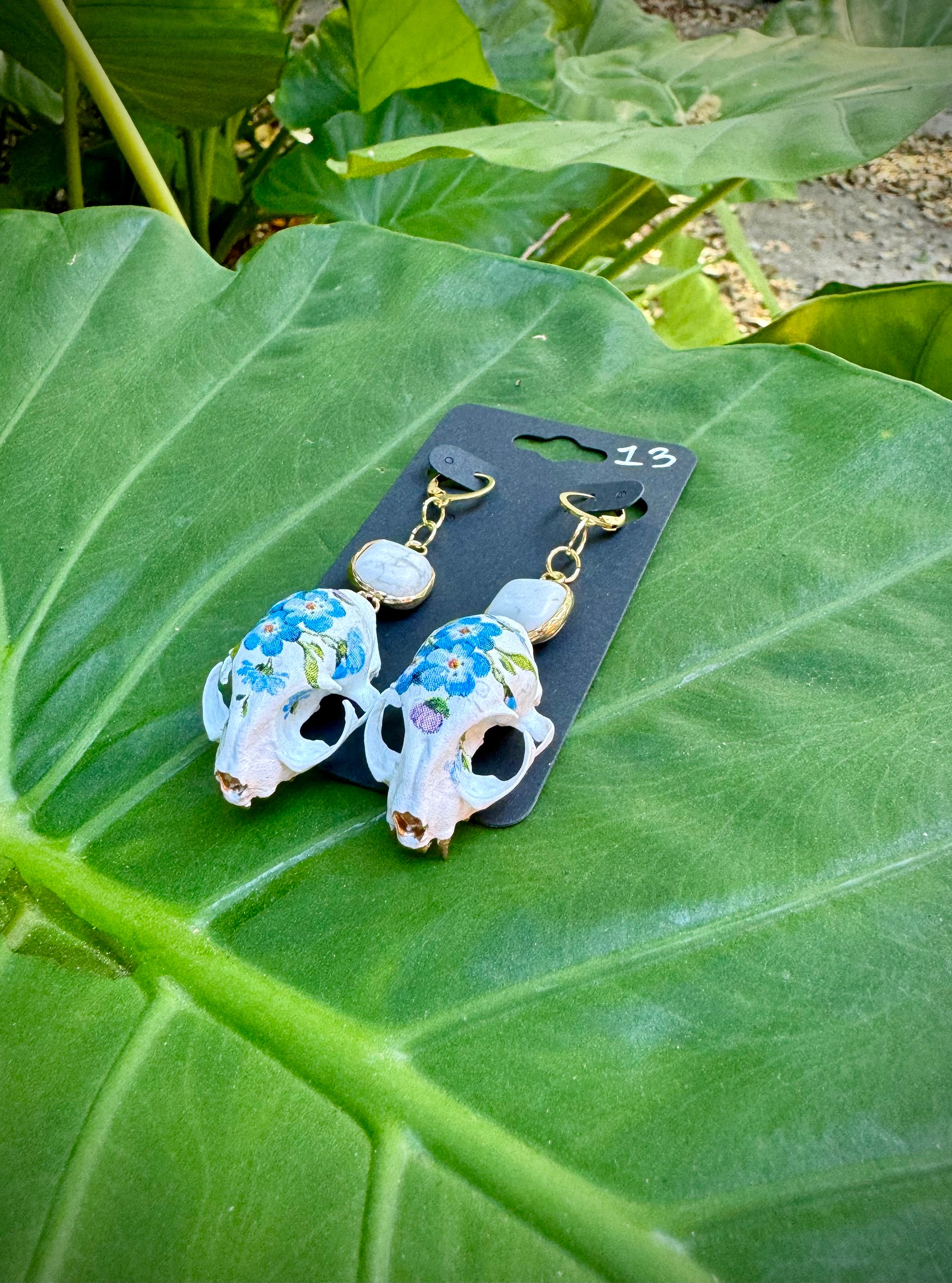 One pair of resin mini cat skull earrings decorated with a blue floral pattern. 18k gold plated leverback style earrings.