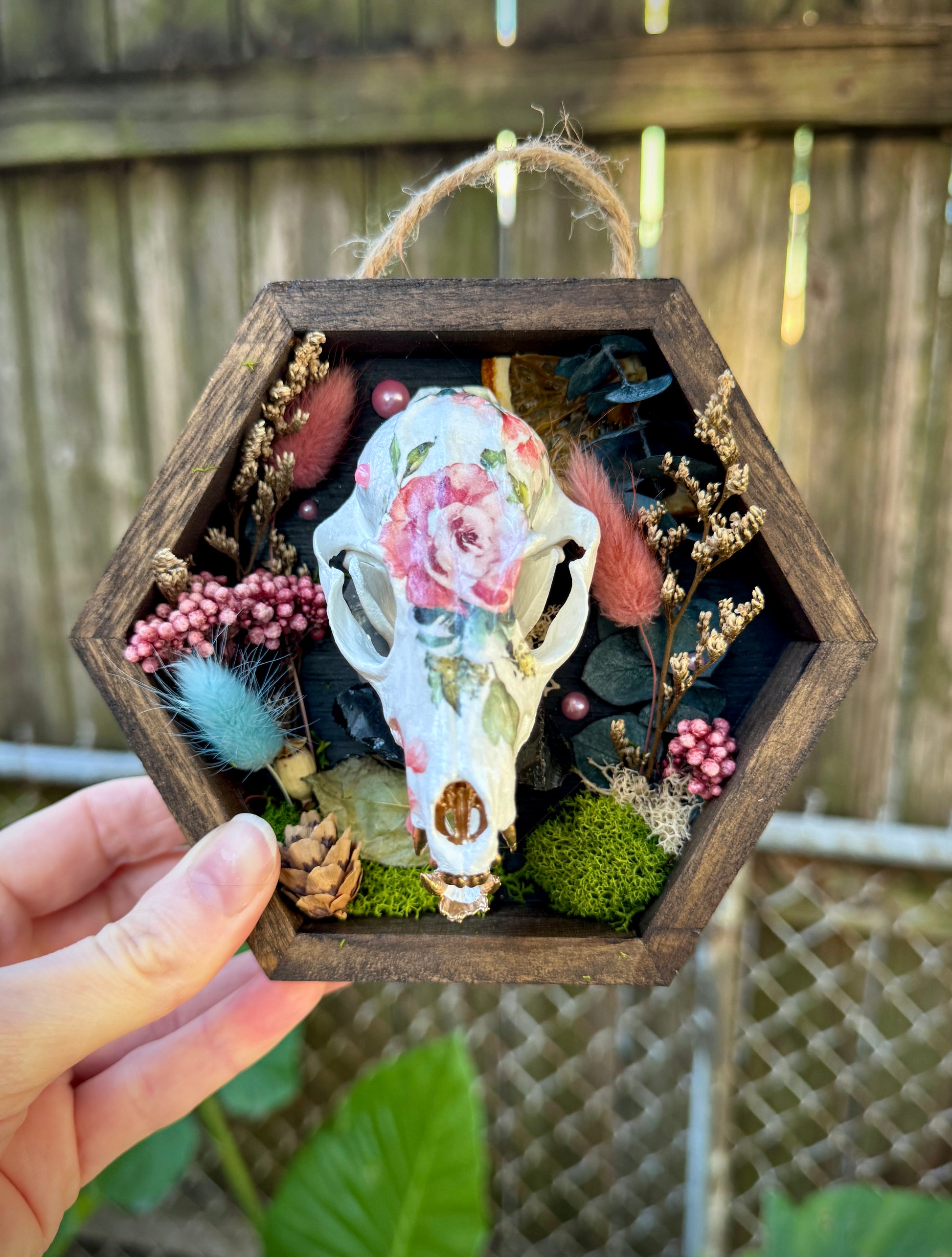 Resin mini fox skull decorated in a springtime floral pattern. Surrounding the skull is an assortment of preserved florals and moss.