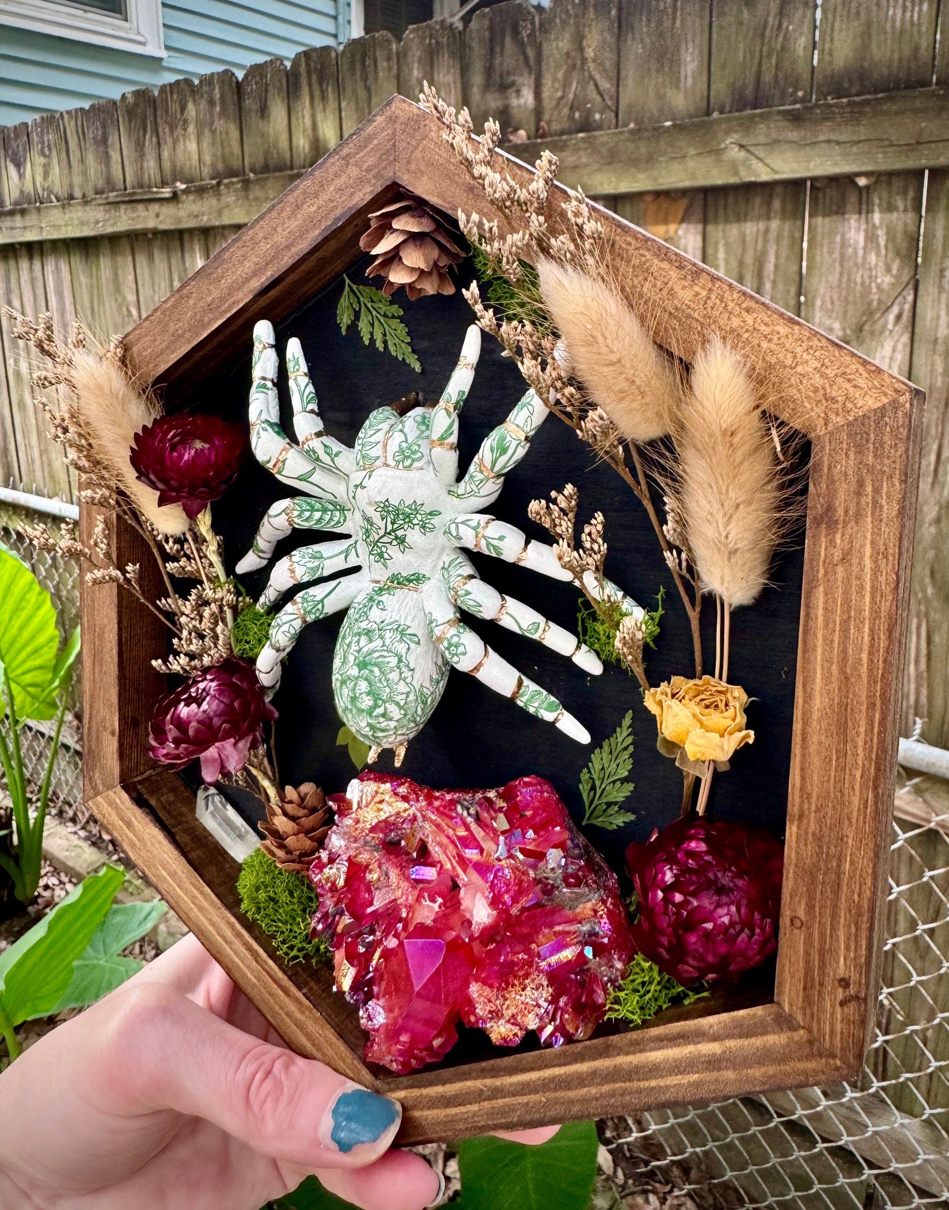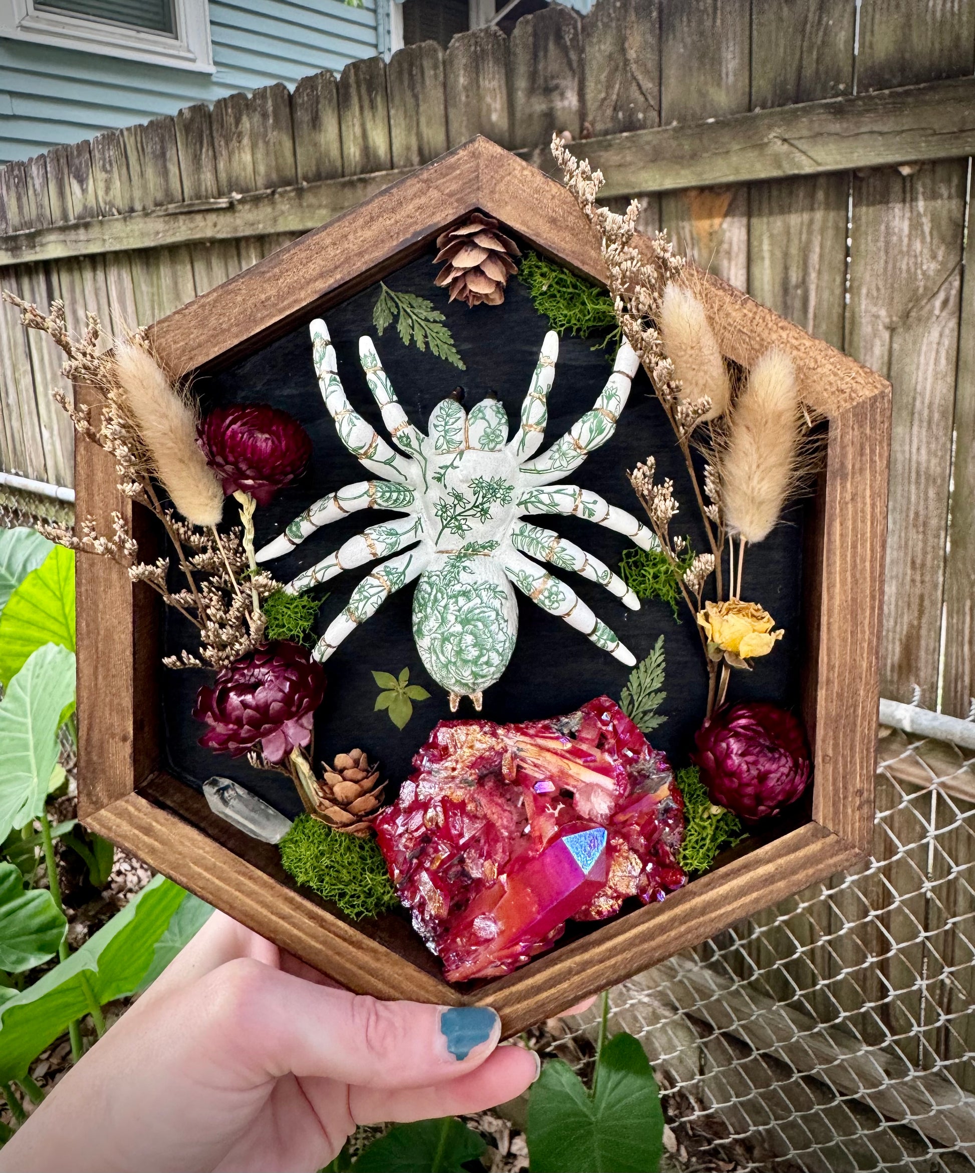 Plastic tarantula decorated in a green illustration pattern. Surrounding your tarantula is an assortment of preserved florals, moss, crystals, and pinecones.